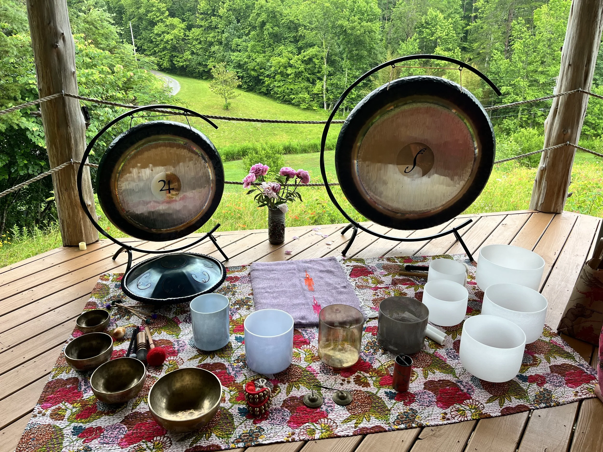 Sound baths use musical harmonics and gentle vibration to support relaxation and nervous system balance. Tibetan singing bowls, voice, and hand percussion create a deeply calming experience for children and adults alike.