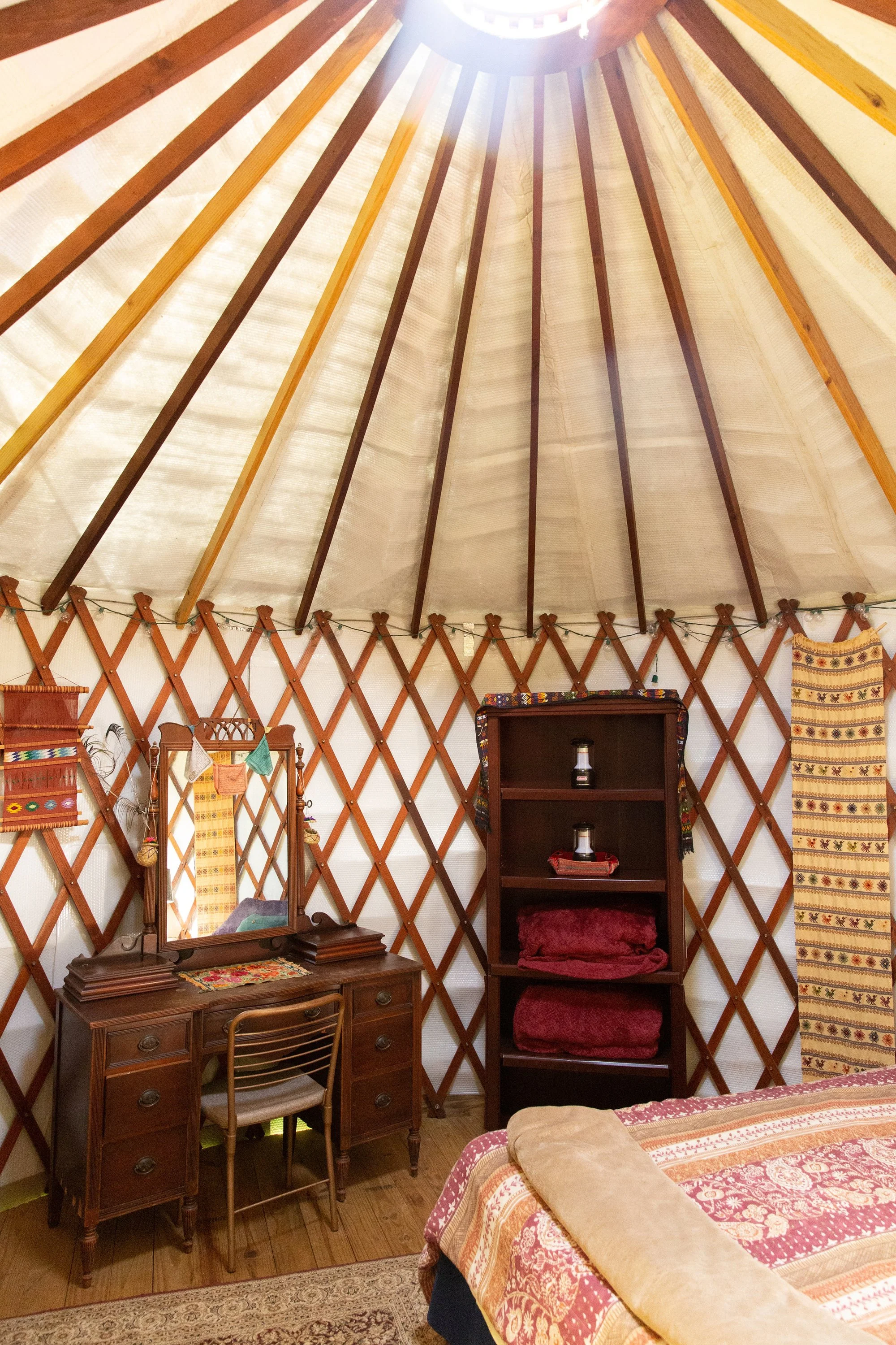 Each yurt is decorated with traditional textiles and artwork from the countries that our family frequents. The yurts are fully furnished including electricity and outlets. We use 100% organic cotton sheets and towels. Each yurt has fans for the heat and extra blankets for the cool nights. Scroll down to "Accommodations" to see the number of beds in each yurt.